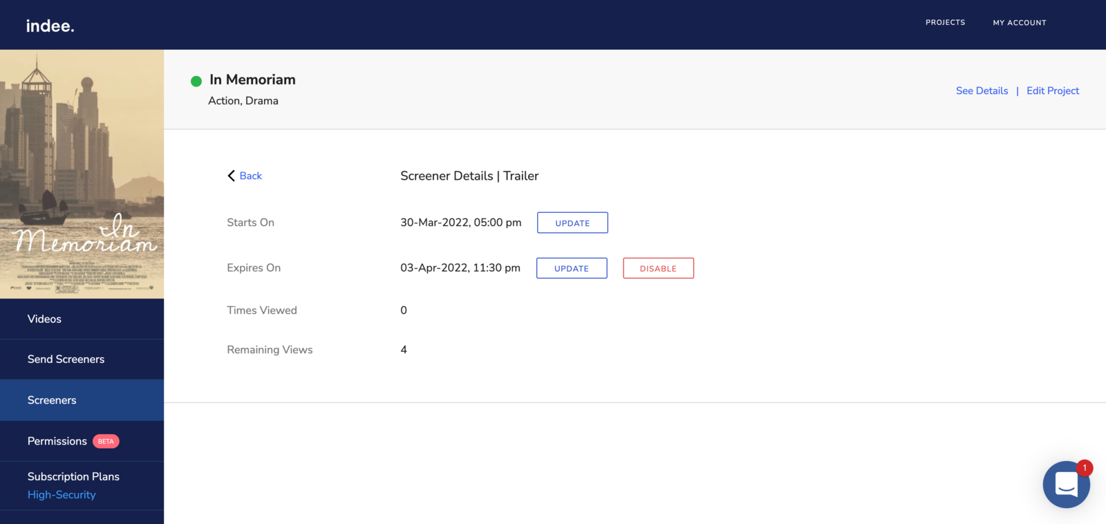 Update the screener details (start/expiry times, views) by clicking on the blue update button. Make adjustments as required and hit ‘update’. This will reinstate the recipient’s access to the screener.