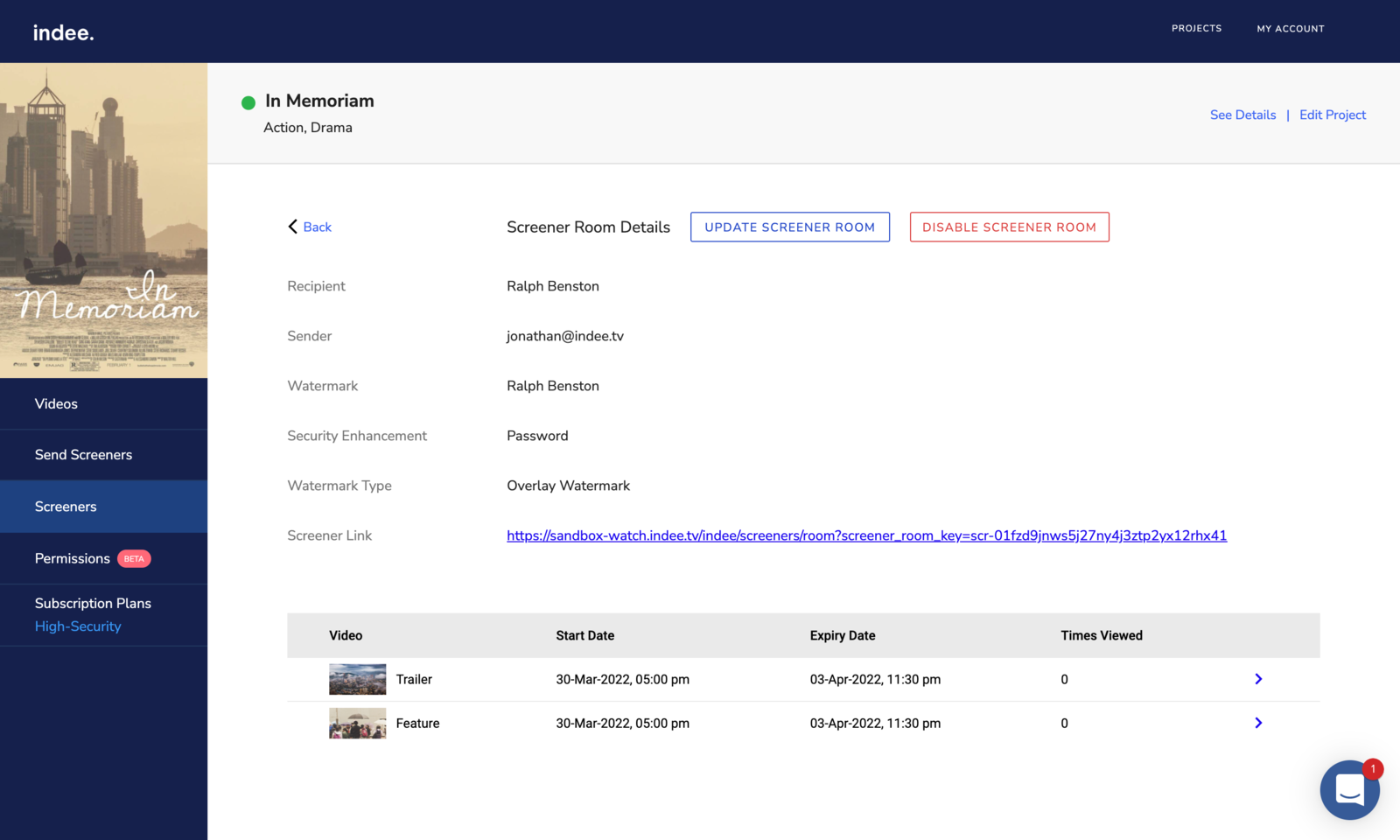 You can choose to update the screener room details (Start/Expiry times, Number of views) by clicking on the blue Update Screener Room button. Any change made here will apply to all the videos within the screener room. Make adjustments as required and hit ‘update’ to reinstate the recipient’s access to the screener room.