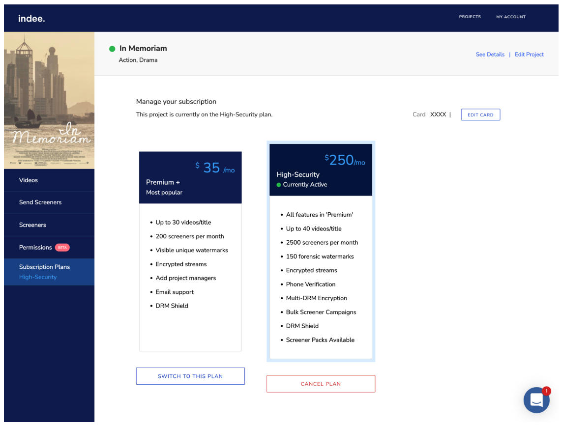 The Subscription Plans page in the project displays the current plan by highlighting the appropriate pricing tile. To switch to a new plan, click on the ‘Switch To This Plan’ button.