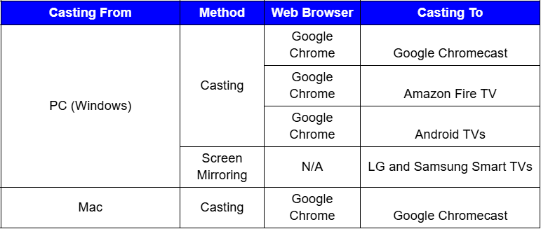 Casting and screen mirroring to Smart TVs are only possible by using the following options: