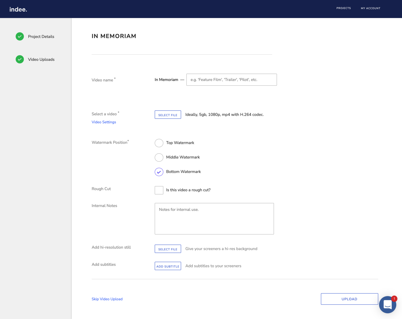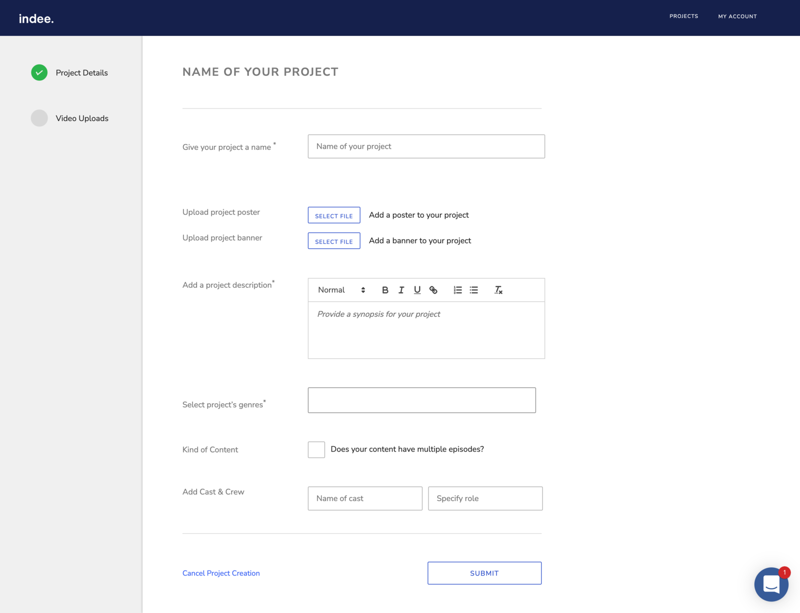 A project on Indee is like a folder management system, where each folder contains videos from a unique production. For e.g. if your current production is called ‘In Memoriam’, all videos pertaining to it would go into the ’In Memoriam’ project (teasers, trailers, feature, etc.).