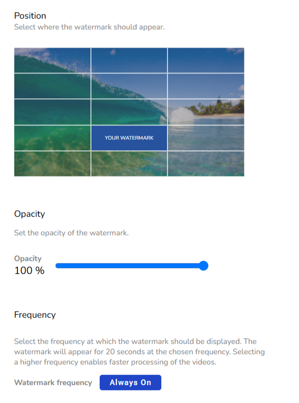 Note: The duration of your video will determine your frequency options. If the duration of your uploaded video is less than 5 minutes, you can only select Always On in the watermark Frequency section.