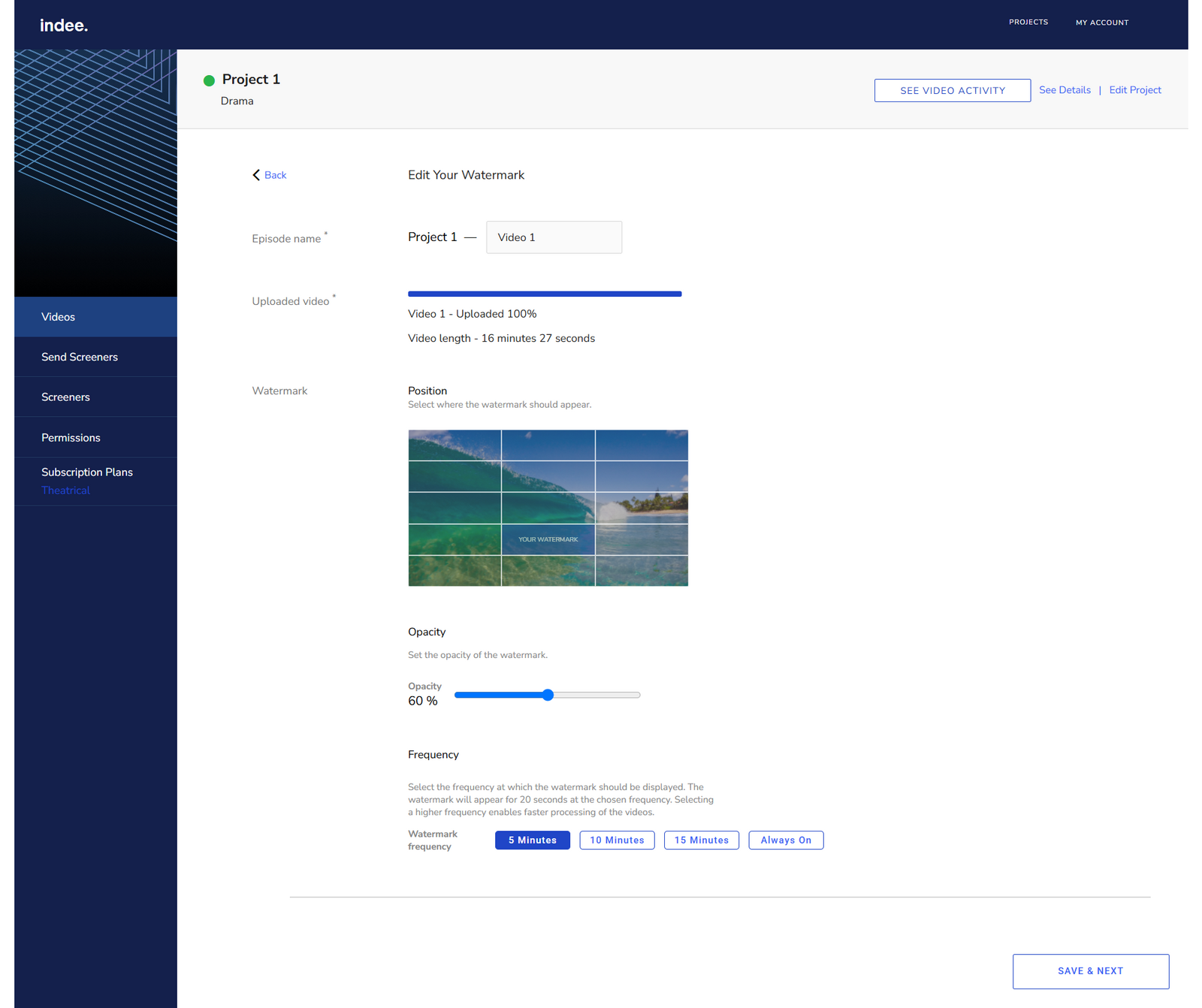 Click Save & Next once you have updated these settings. You will reach the Videos page, and your video might still be getting transcoded. Once your video has been successfully transcoded, you will be notified by email that you can send out screeners.