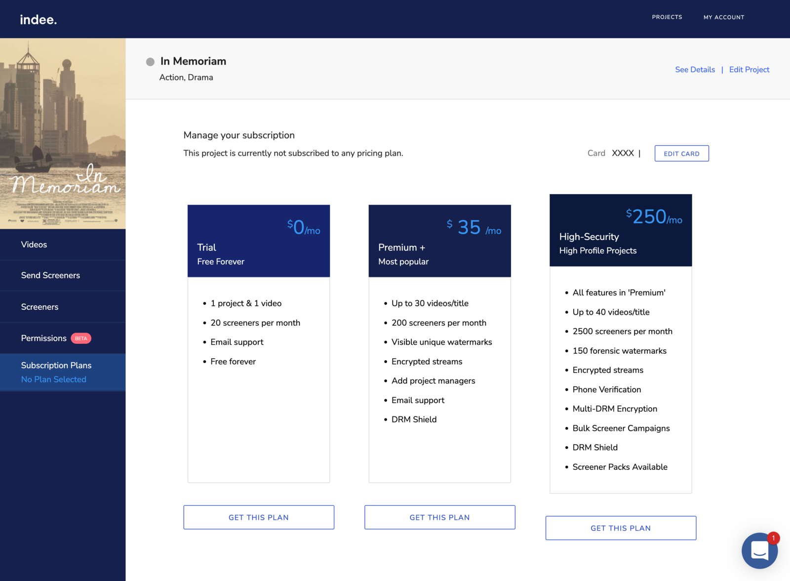 The final step in project creation is selecting a subscription plan. On successfully uploading a video, you will be redirected to the ‘Subscriptions’ section within the newly created project. You can choose a subscription based on your screening requirements. Indee bills you per project every month. This affords you the flexibility of paying only for projects you are using, rather than for all projects all of the time.