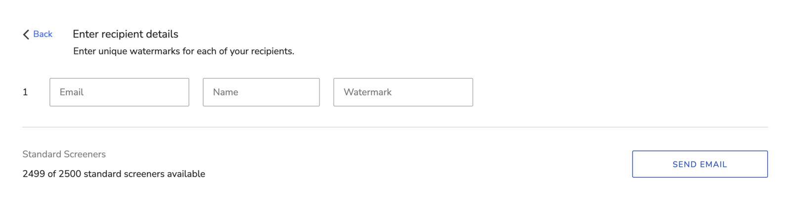 The final step in sending your screeners is to add in your recipients’ information. Depending on your screener settings, you may be required to fill in the recipient’s watermark, email, name and password. Our smart address book populates all fields once an email has been entered. This only works if the recipient isn’t new and has received a screener from your account in the past. Once you’ve added in all the required information, hit generate screeners and you should have your links or emails generated immediately.