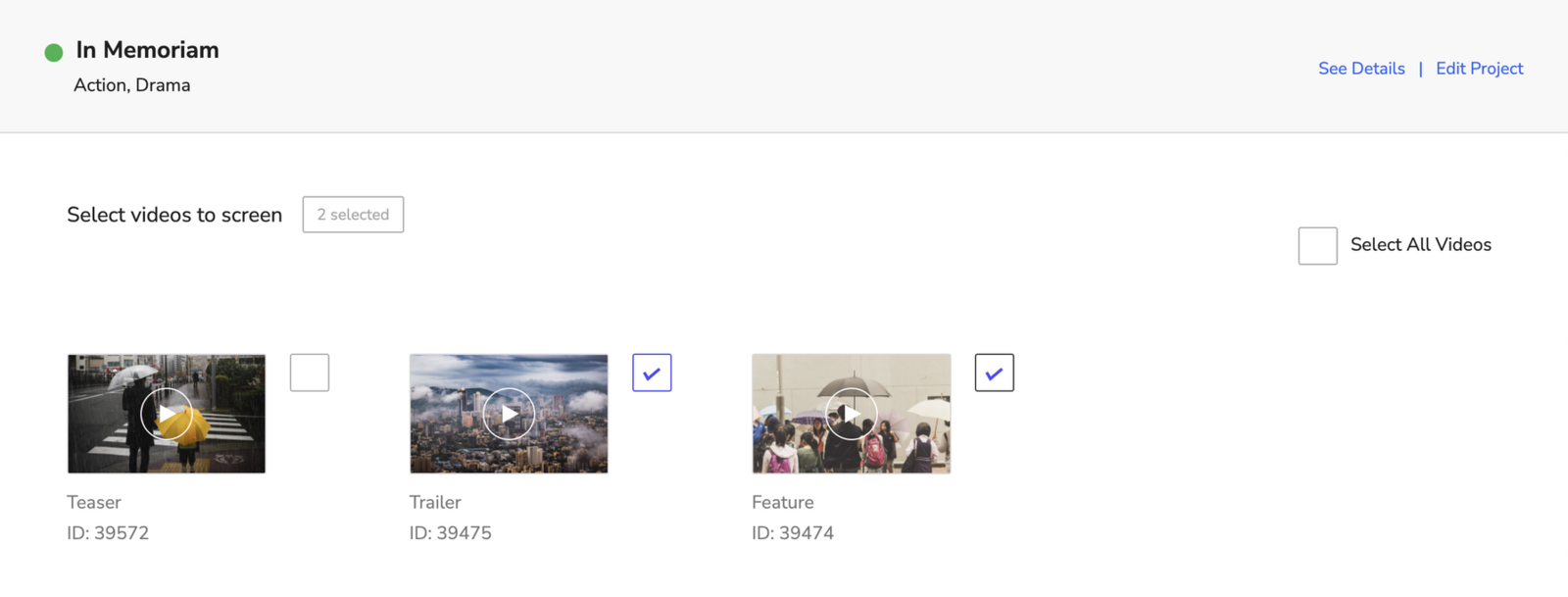 The first step towards sending screeners is to select the video(s) you would like to screen. Every screening link you create is a screener room which can house one or more screeners within it. This is beneficial if you’d like to share a feature film along with trailers or for multiple episodes in case of TV content.