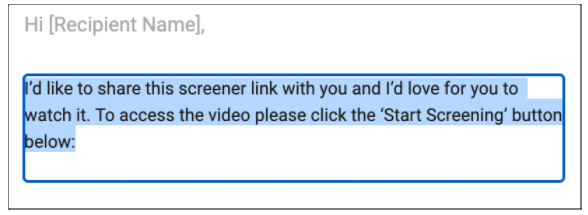 If you've chosen email as your screener type, Indee provides the option of customizing the email. Only a small portion of the body of your email (refer to image) can be changed to include a message of your choice to your viewers. Remember to head to My Account > Settings and select the option "Customize email template"